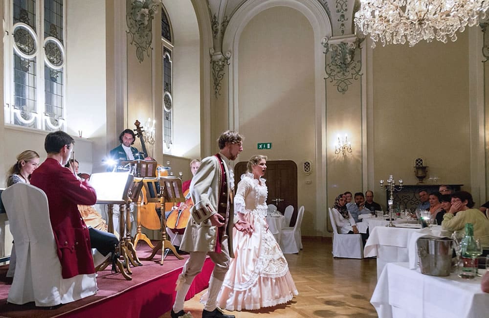 每晚,贵宾们将享用精心烹制的三道式晚餐,菜式灵感源自18世纪——莫扎特生活的黄金年代。在每道佳肴呈献的间隙,萨尔茨堡阿马德乌斯乐团的音乐家与歌剧演唱家们,将身着考究的复古服饰,为您倾情演绎莫扎特歌剧经典选段:《魔笛》的天籁之音、《唐·乔瓦尼》的激情咏叹,以及《费加罗的婚礼》的华美乐章。这一刻,您将完全沉浸在18世纪的艺术氛围中,亲身体验那个音乐巨匠辈出的辉煌时代。